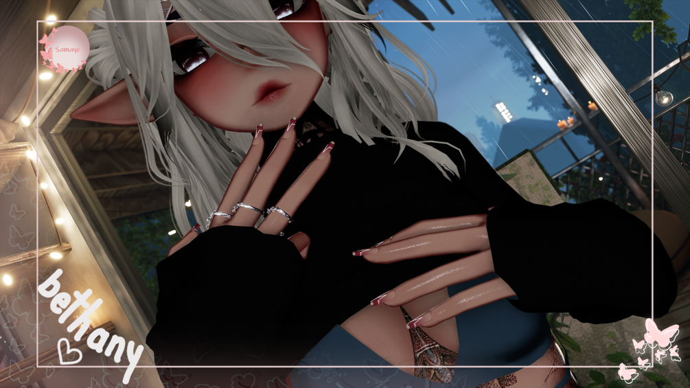 Body (edited by me), Face, Main Hair, Buns, Ears, Shirt, Bra, Undies, Robe, Tattoo, Shorts, Boots, Hand Chain, Leg Straps, Face Texture, Circlet, Nail Cuts, Blindfold