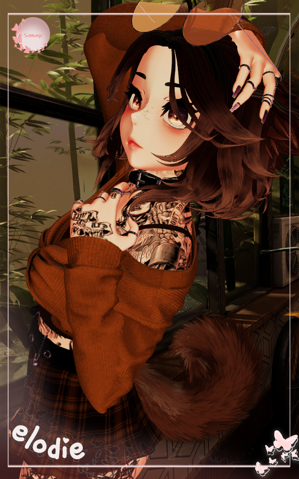 Zinfit Base, Pursu Head (Face Tracking edited by me), Short Hair, Ponytail, Long Hair, Bangs, Hoodie, Knotted Sweater, Plaid Skirt, Shorts, Pants, Heels, Socks, Fishnets, Collar, Ears, Tail, Arm Warmers, Tattoo, Harness Set, Glasses, Bra, Rings